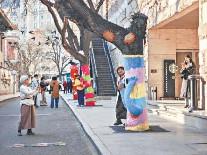 降雪前线上股票配资软件,东城区红星胡同的大树穿上“毛衣”,市民纷纷打卡。乔健摄